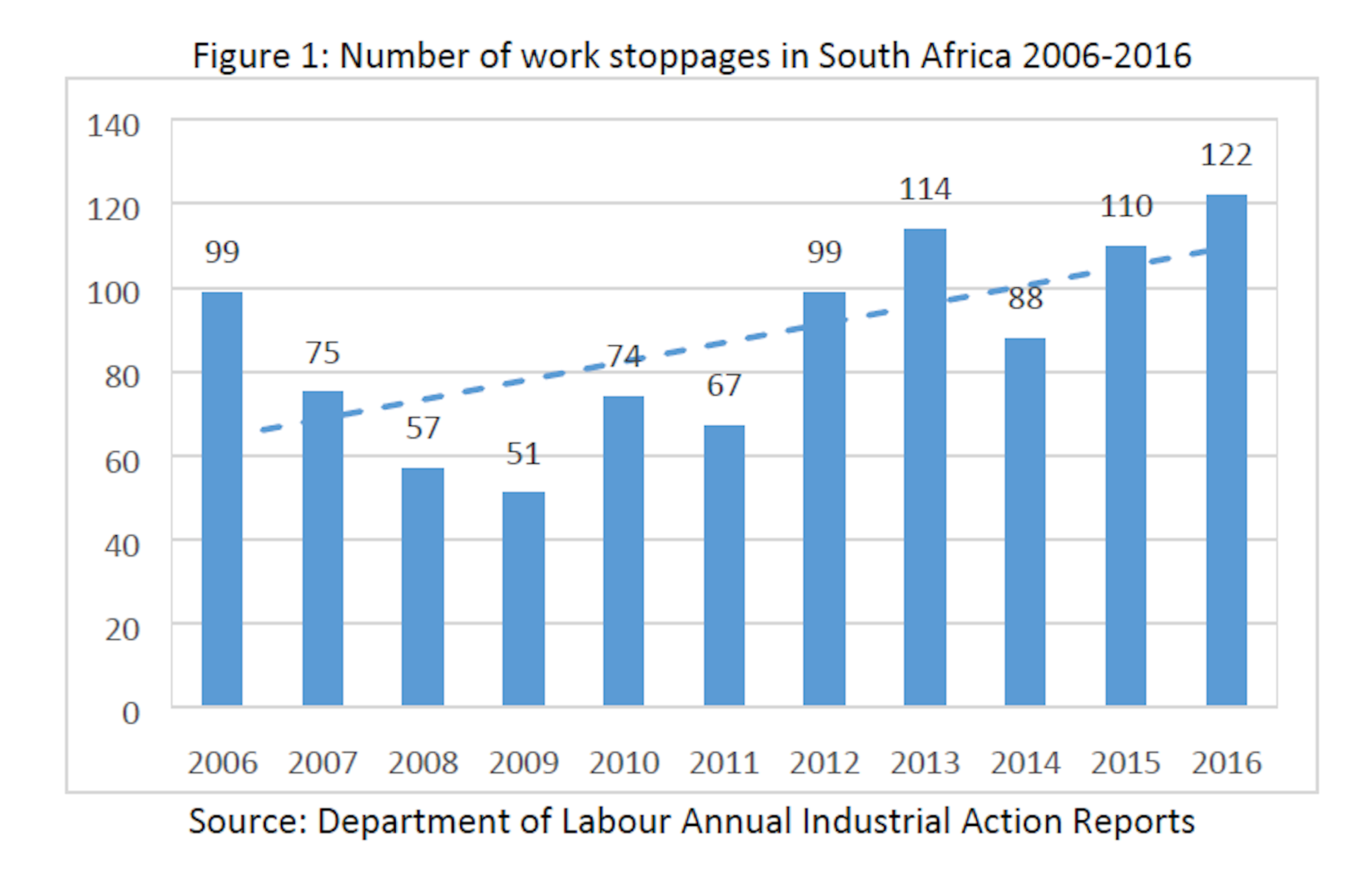 Figure 1. Number of industrial actions 2006-2016. Department of Labour Industrial Action Annual Reports