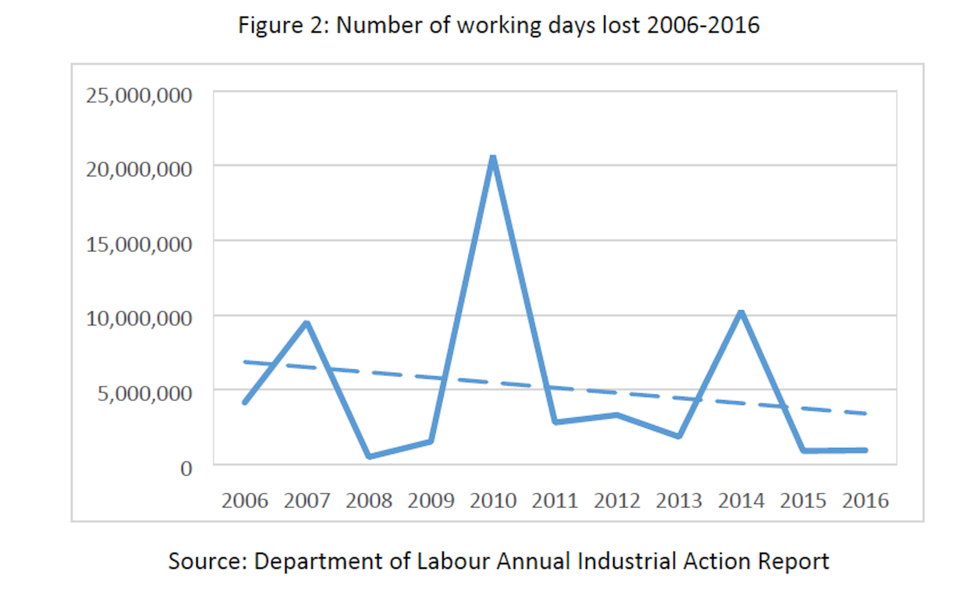 Figure 2. Number of working days lost, 2006 – 2016. Department of Labour Annual Industrial Action Report
