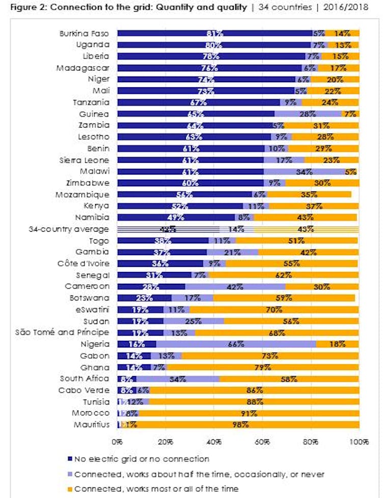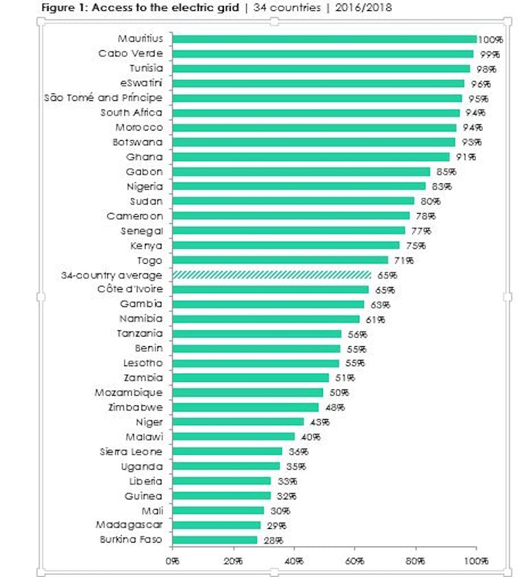Access to an electric grid varied widely by country. While virtually all Cabo Verdeans, Mauritians, and Tunisians lived in zones served by a grid, fewer than one-third of citizens in Burkina Faso (28%), Madagascar (29%), Mali (30%), Guinea (32%), and Liberia (33%) enjoyed the same access (Figure 1).