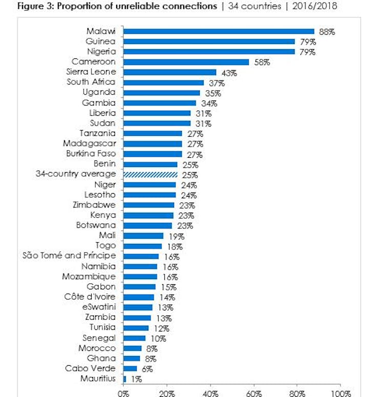 Nor does being connected guarantee power. Power cuts continued to plague some countries. About one in seven respondents (14%) had a connection but reported that their power worked half the time, or less. All in all, taking into account households with no access to a grid, no connection to an existing grid, or an unreliable supply, only 43% of Africans enjoyed a reliable supply of electricity. While the comparable figure was nine out of 10 in Mauritius (98%) and Morocco (91%), it barely exceeded one in 20 citizens in Malawi (5%) and Guinea (7%).